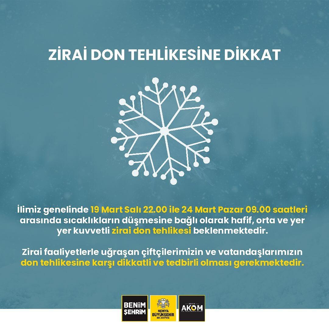 Konya Akom çiftçileri ve vatandaşları zirai dona karşı uyardı.Konya Akom'un sosyal medya üzerinden yaptığı açıklamada: