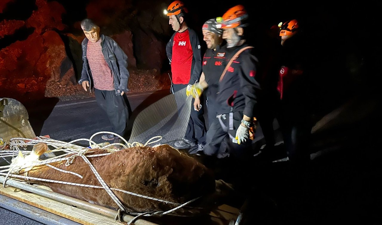 Antalya'nın Alanya ilçesinde kamyon kasasından düşerek uçuruma yuvarlanan dana, 10 saatlik çalışmayla kurtarıldı.