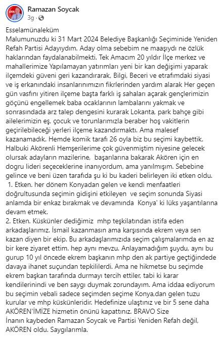 2. Etken. Küskünler dediğimiz MHP teşkilatından istifa eden arkadaşlarımız. İsmail kazanmasın ama karşısında Ekrem veya sen kazan diyen bir ekip. Bu arkadaşlarımızıda seçim çalışmalarımda en az bir kere ziyaret ettim. Hep aynı mevzu. Anlayamadığım şuydu, aynı bu gurup 10 yıl öncede Ekrem başkanın MHP den ak partiye geçtiğinde de davaya ihanet suçundan tepkililerdi. Ama ne hikmetse bu seçimde Ekrem başkan tarafında durmayı tercih ettiler, tabi ki karar kendilerinindi ve ben saygı duymak zorundayım. Ama iddia ediyorum bu seçimin vebali sadece seçimden seçime Konya'dan gelen tuzu kurular ve MHP küskünleridir. Hedefinize ulaştınız ve bir 5 sene daha AKÖREN'İMİZE hizmetin önünü kapattınız. BRAVO Size İnanın kaybeden Ramazan Soycak ve Partisi Yeniden Refah değil, AKÖREN oldu. Saygılarımla.''dedi.