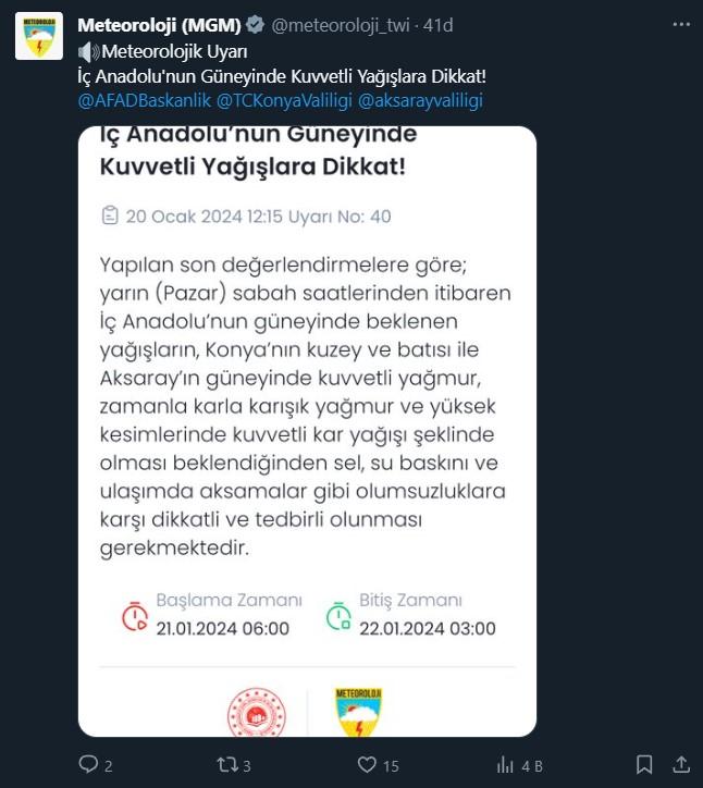 ‘'Yapılan son değerlendirmelere göre yarın (Pazar) sabah saatlerinden itibaren İç Anadolu'nun güneyinde beklenen yağışların, Konya'nın kuzey ve batısı ile Aksaray'ın güneyinde kuvvetli yağmur zamanla karla karışık yağmur ve yüksek kesimlerde kuvvetli kar yağışı şeklinde olması beklendiğinden sel, su baskını ve ulaşımda aksamalar gibi olumsuzluklara karşı dikkatli olunması gerekmektedir.''ifadelerine yer verdi