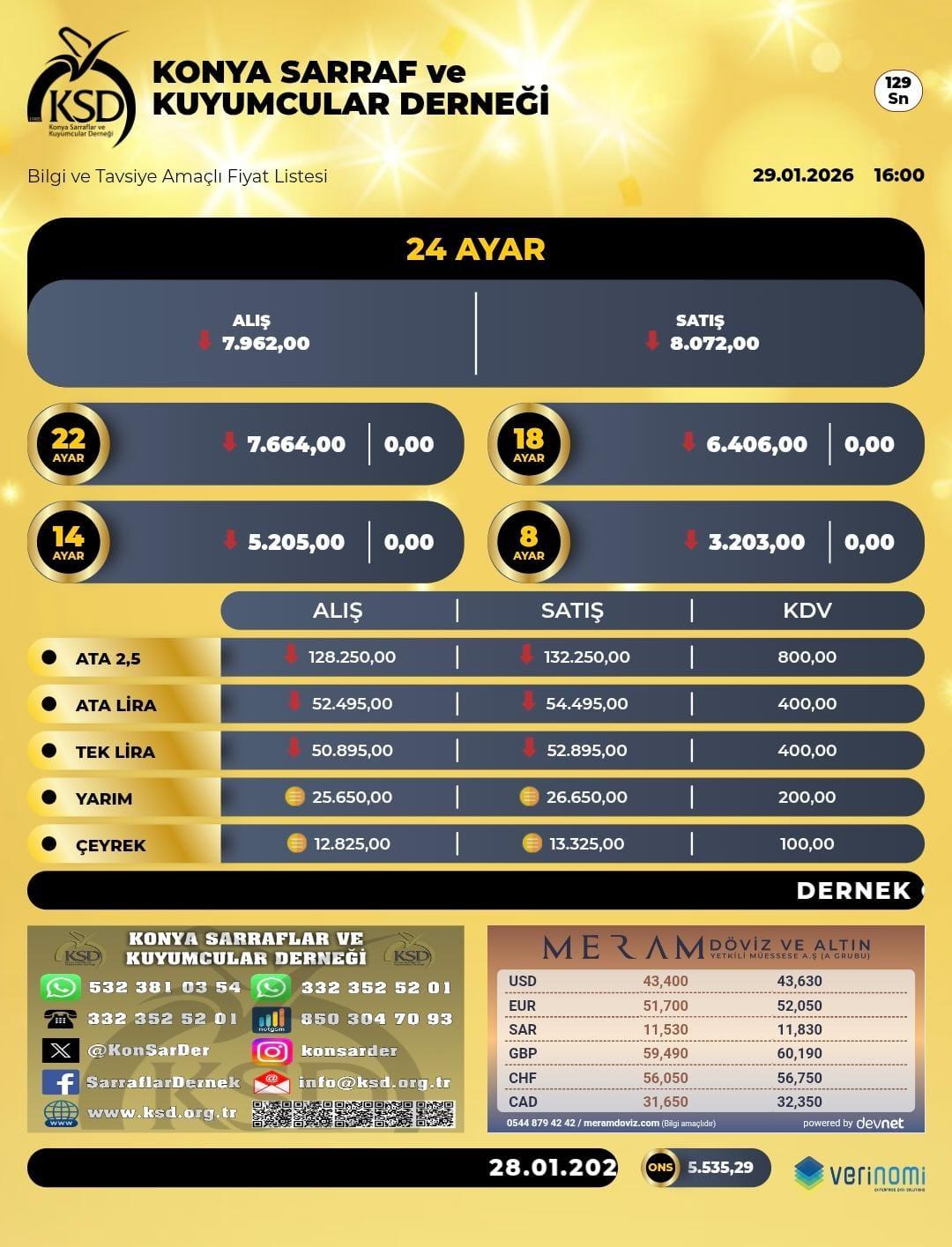 Konya Sarraflar ve Kuyumcular Derneği tarafından açıklanan 29 Ocak 2026 tarihli bilgilendirme amaçlı fiyat listesine göre altın fiyatlarında aşağı yönlü bir seyir dikkat çekti.