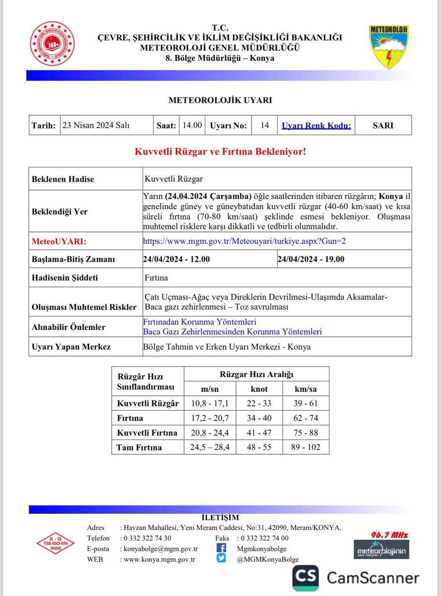 Kuvvetli rüzgarın saat 12.00 ile 19.00 arasında gerçekleşmesi bekleniyor. Konyalıların bu saatte dışarıya çıkarken dikkatli ve tedbirli olmaları gerektiği konusunda da ayrıca uyarıldı.