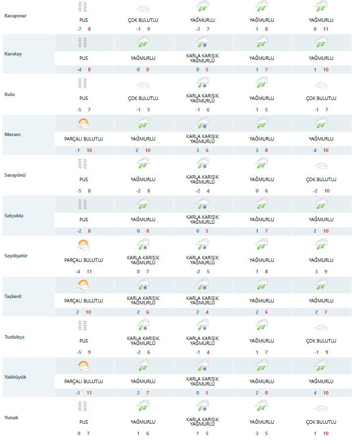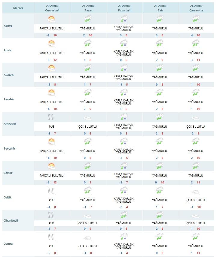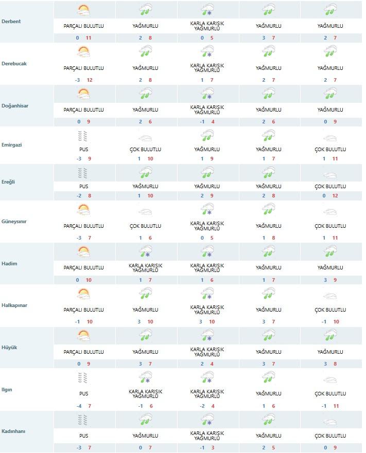 Ahırlı, Akören, Akşehir, Altınekin, Beyşehir, Bozkır, Çeltik, Çumra, Derbent, Derebucak, Doğanhisar, Güneysınır, Hadim, Halkapınar, Hüyük, Ilgın, Kadınhanı, Karatay, Kulu, Meram, Sarayönü, Selçuklu, Seydişehir, Taşkent, Tuzlukçu, Yalıhüyük ve Yunak ilçelerinde kar yağışı beklenirken, diğer ilçelerde ise sağanak yağışın görüleceği tahmin ediliyor.