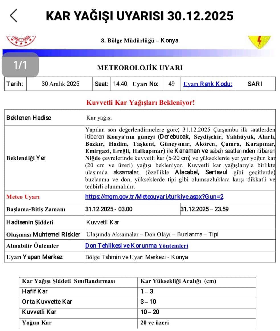 Meteoroloji 8. Bölge Müdürlüğü (Konya), 31 Aralık 2025 Çarşamba günü itibarıyla Konya genelinde etkili olması beklenen kuvvetli kar yağışı nedeniyle sarı kodlu uyarı yayımladı.