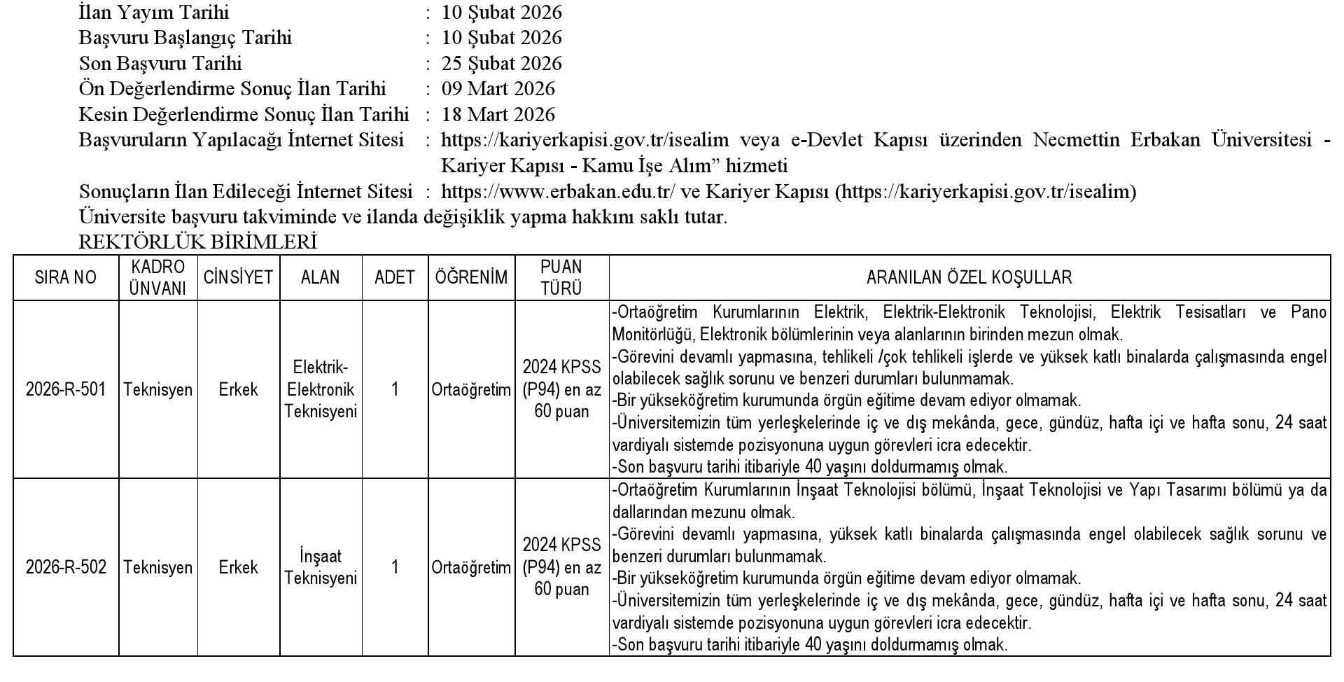 Başvurular, ilanın Resmi Gazete'de yayımlandığı 10 Şubat 2026 tarihinden itibaren 15 gün içinde e-Devlet üzerinden "Necmettin Erbakan Üniversitesi – Kariyer Kapısı İşe Alım” hizmeti ya da Kariyer Kapısı internet adresi üzerinden yapılabilecek. Şahsen veya posta yoluyla yapılan başvurular kabul edilmeyecek.