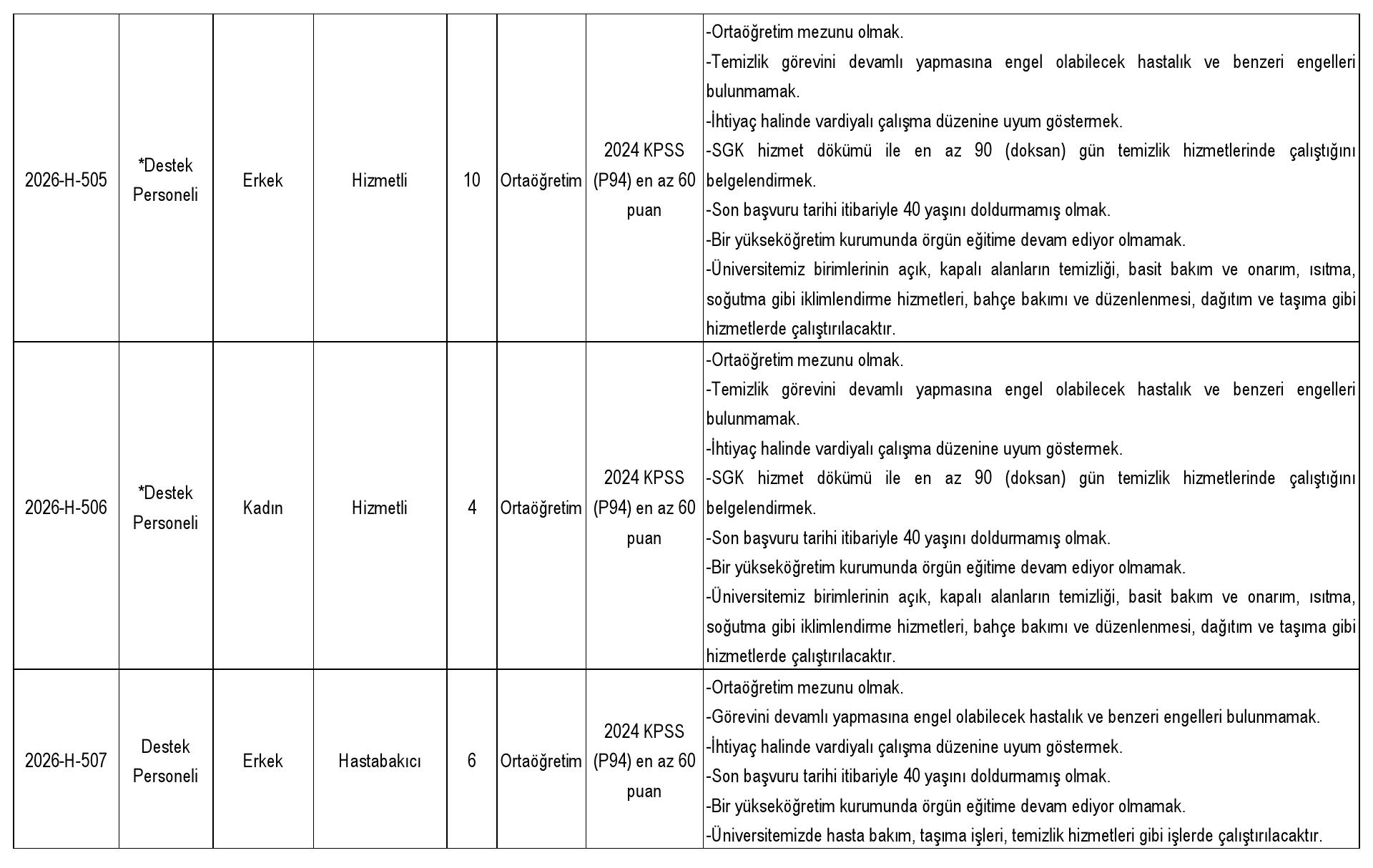 Teknisyen ve destek personeli kadrolarına yalnızca ortaöğretim mezunlarının başvurabileceği belirtilirken, bu adayların başvuru tarihi itibarıyla örgün yükseköğretimde aktif ya da pasif öğrenci kaydının bulunmaması şartı getirildi.