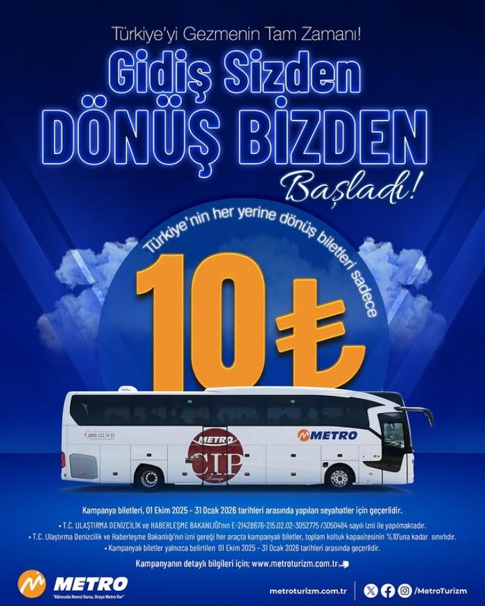 Metro Turizm tarafından yapılan açıklamaya göre, 1 Ekim 2025 ile 31 Ocak 2026 tarihleri arasında geçerli olacak kampanya kapsamında, aynı anda alınan gidiş–dönüş biletlerinde, dönüş bileti yalnızca 10 TL olacak. Bu sayede yolcular, hem kısa mesafeli hem de uzun yolculuklarda çok daha ekonomik seyahat edebilecek.