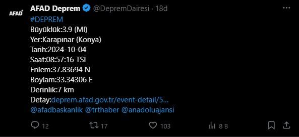 '' İlimiz Karapınar İlçesinde saat 08.57 sıralarında 3.9 büyüklüğünde deprem meydana gelmiş olup, herhangi bir olumsuz ihbar ulaşmamıştır. Saha taraması devam etmektedir. Depremi hisseden hemşehrilerimize geçmiş olsun. Kamuoyuna saygıyla duyurulur.'' ifadelerine yer verdi.