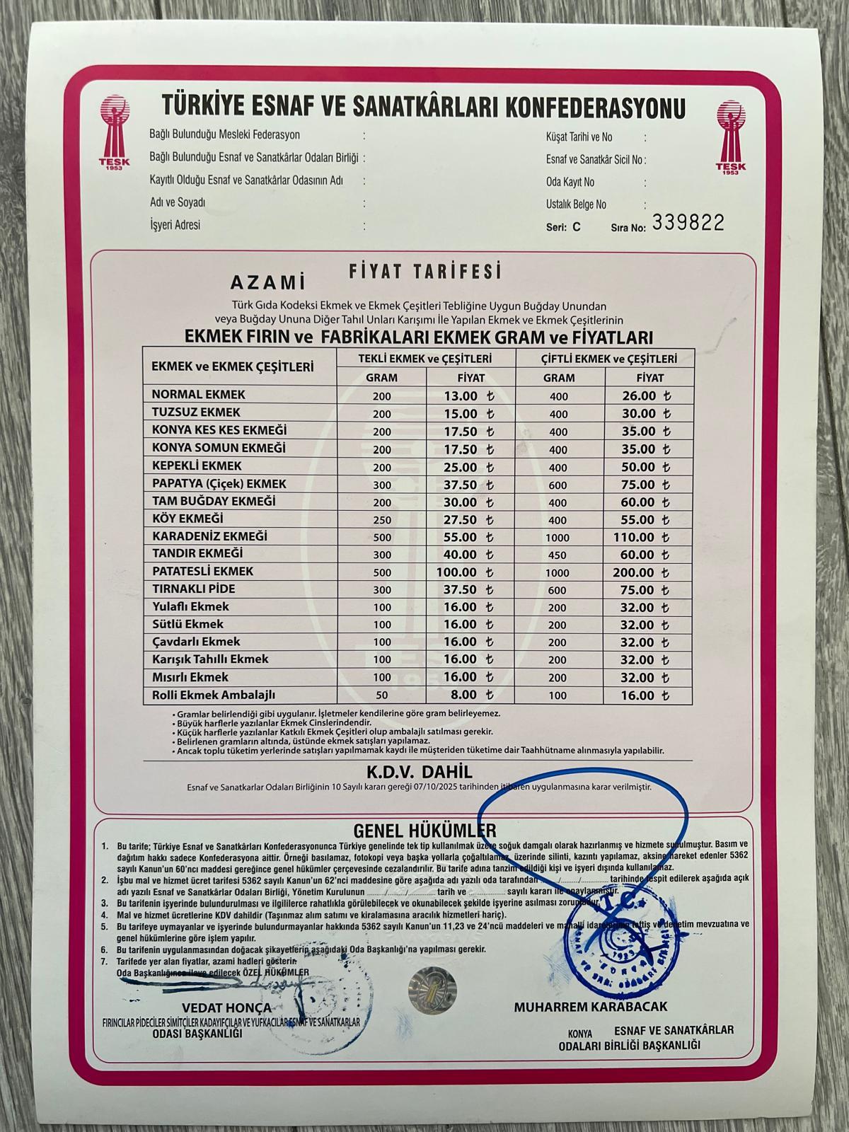 Fırıncılar Odası tarafından hazırlanan ve Türkiye Esnaf ve Sanatkârları Konfederasyonu (TESK) tarafından onaylanan yeni fiyat tarifesi, 21 Ekim 2025 Salı gününden itibaren geçerli olacak.
