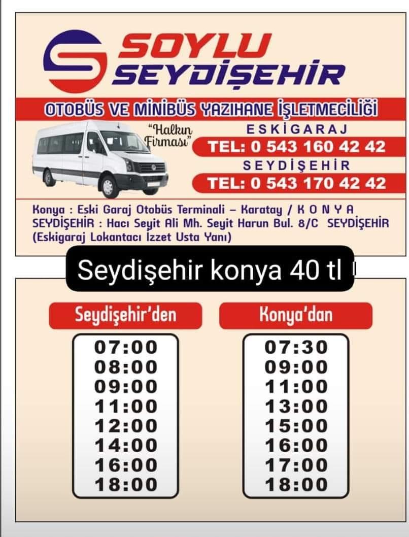 Soylu Seydişehir firma sahibi Ömer Araç  müjdeyi verdi. Seydişehir - Konya arası 91 km taşıma hizmetinde Soylu Seydişehir firması indirime gitti.  Firma sahibi Araç, Seydişehir-Konya arası minibüs fiyatlarının 40 TL olarak hizmete geçtiğini bildirdi.