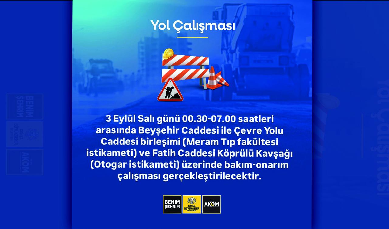 ''3 Eylül Salı günü 00.30-07.00 saatleri arasında Beyşehir Caddesi ile Çevre Yolu Caddesi birleşimi (Meram Tıp fakültesi istikameti) ve Fatih Caddesi Köprülü Kavşağı (Otogar istikameti) üzerinde bakım-onarım çalışması gerçekleştirilecektir. Çalışmalar esnasında yol araç trafiğine kapatılacak, trafik alternatif güzergahlardan sağlanacaktır.'' ifadelerine yer verdi.
