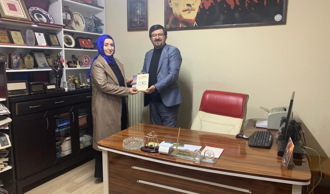 Ziyaret Başkan Şahin'in AK Parti Meram Kadın Kolları Başkanı Serpil Yurdaışık'a Gönül Gözüyle Engelsiz Portreler adlı kitabını takdim etmesi ve günün anısına çekilen hatıra fotoğrafı ile sona erdi