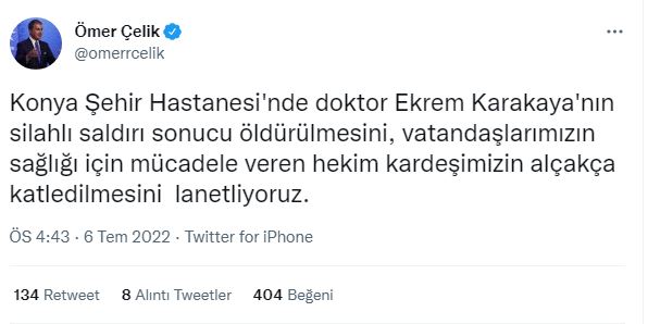 AK Parti Genel Başkan Yardımcısı, Parti Sözcüsü Ömer Çelik, sosyal medya hesabından, "Konya Şehir Hastanesi'nde doktor Ekrem Karakaya'nın silahlı saldırı sonucu öldürülmesini, vatandaşlarımızın sağlığı için mücadele veren hekim kardeşimizin alçakça katledilmesini lanetliyoruz." paylaşımında bulundu.