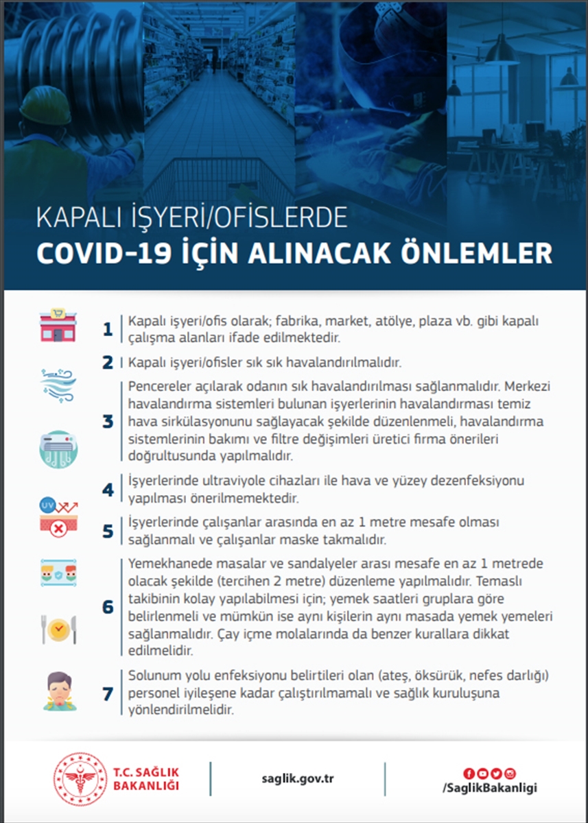 Sağlık Bakanlığından kapalı ofis ve iş yerleri için Kovid-19 uyarıları - Fabrika, market, atölye, plaza gibi kapalı iş yerleri ve ofis çalışma alanlarında koronavirüse karşı alınması gereken önlemleri içeren broşür hazırlandı