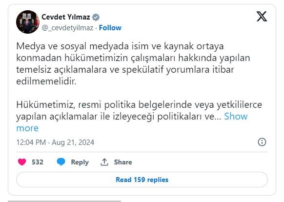 Yılmaz, sosyal medya hesabından yaptığı açıklamada, medya ve sosyal medyada isim ve kaynak ortaya konmadan hükümetin çalışmaları hakkında yapılan temelsiz açıklamalara ve spekülatif yorumlara itibar edilmemesi gerektiğini vurguladı.